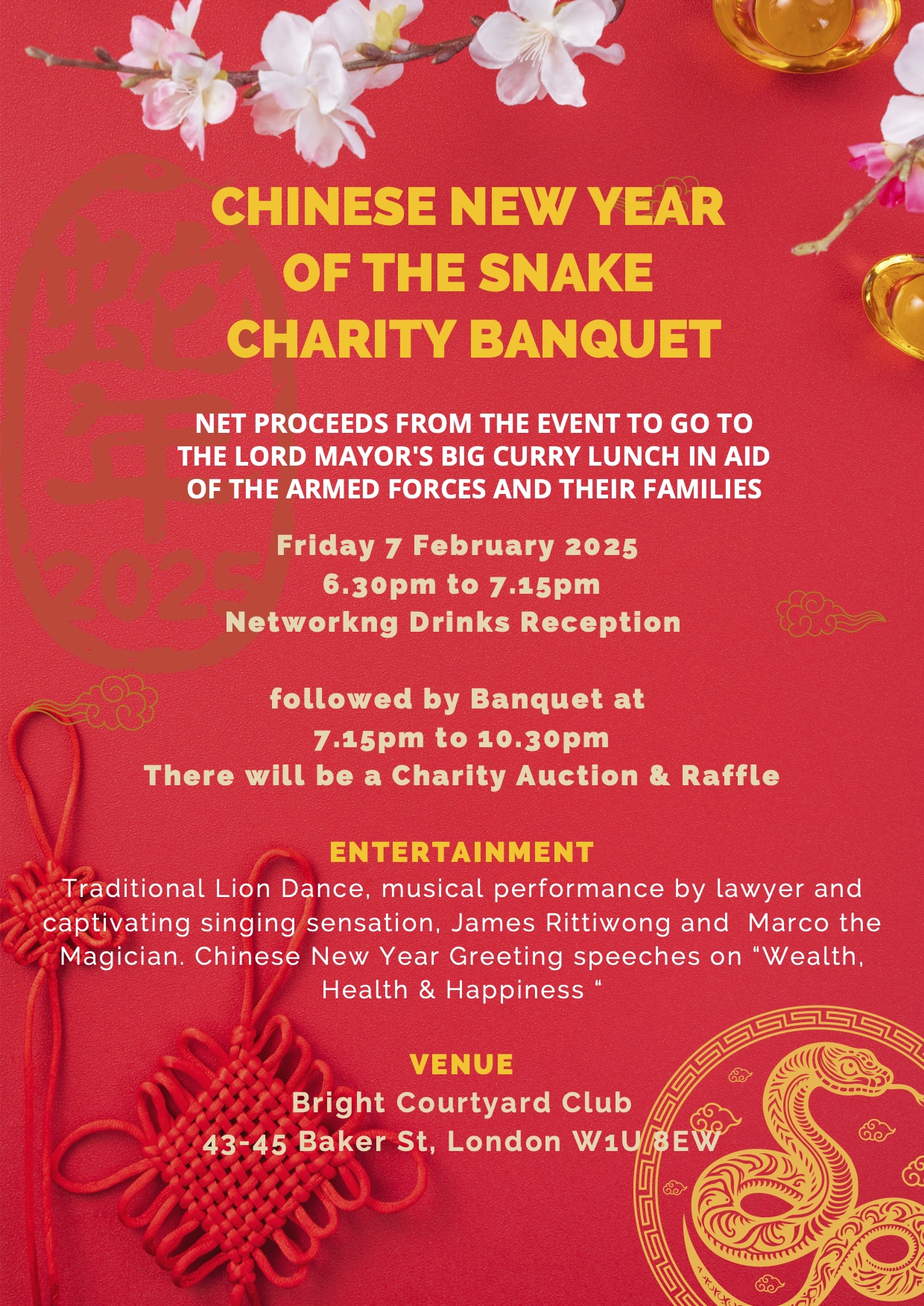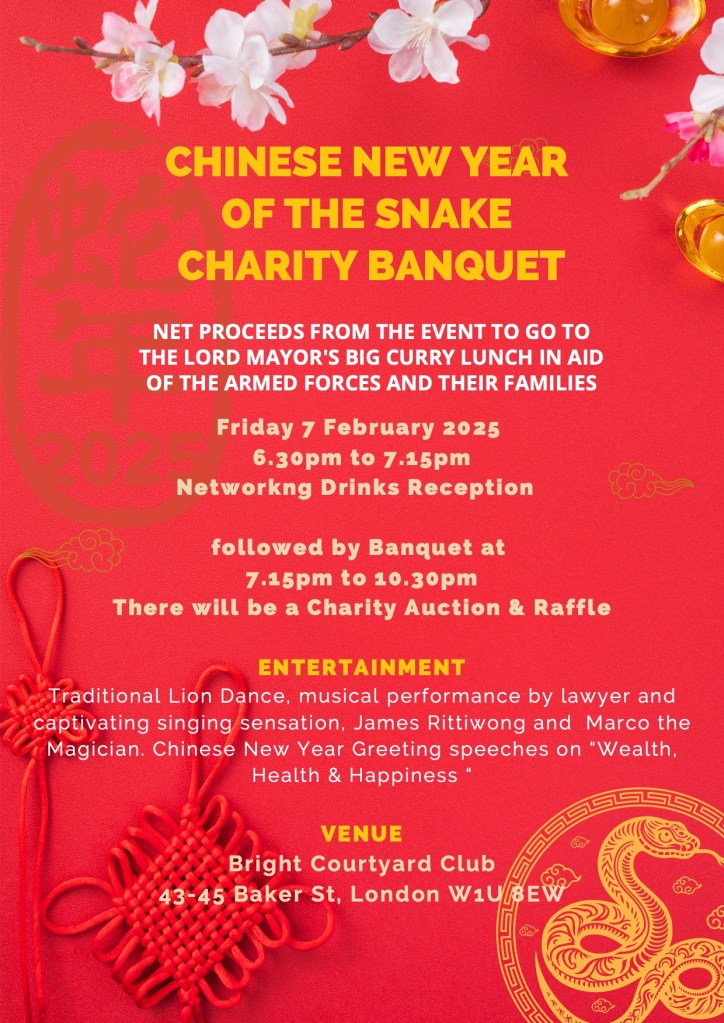 As well as the banquet itself members can enjoy a drinks reception, with Chinese calligraphy and painting; musical entertainment in the form of a Lion Dance, Chinese Opera, and Guzheng (Chinese Harp). The evening will conclude with a charity auction and raffle draw.